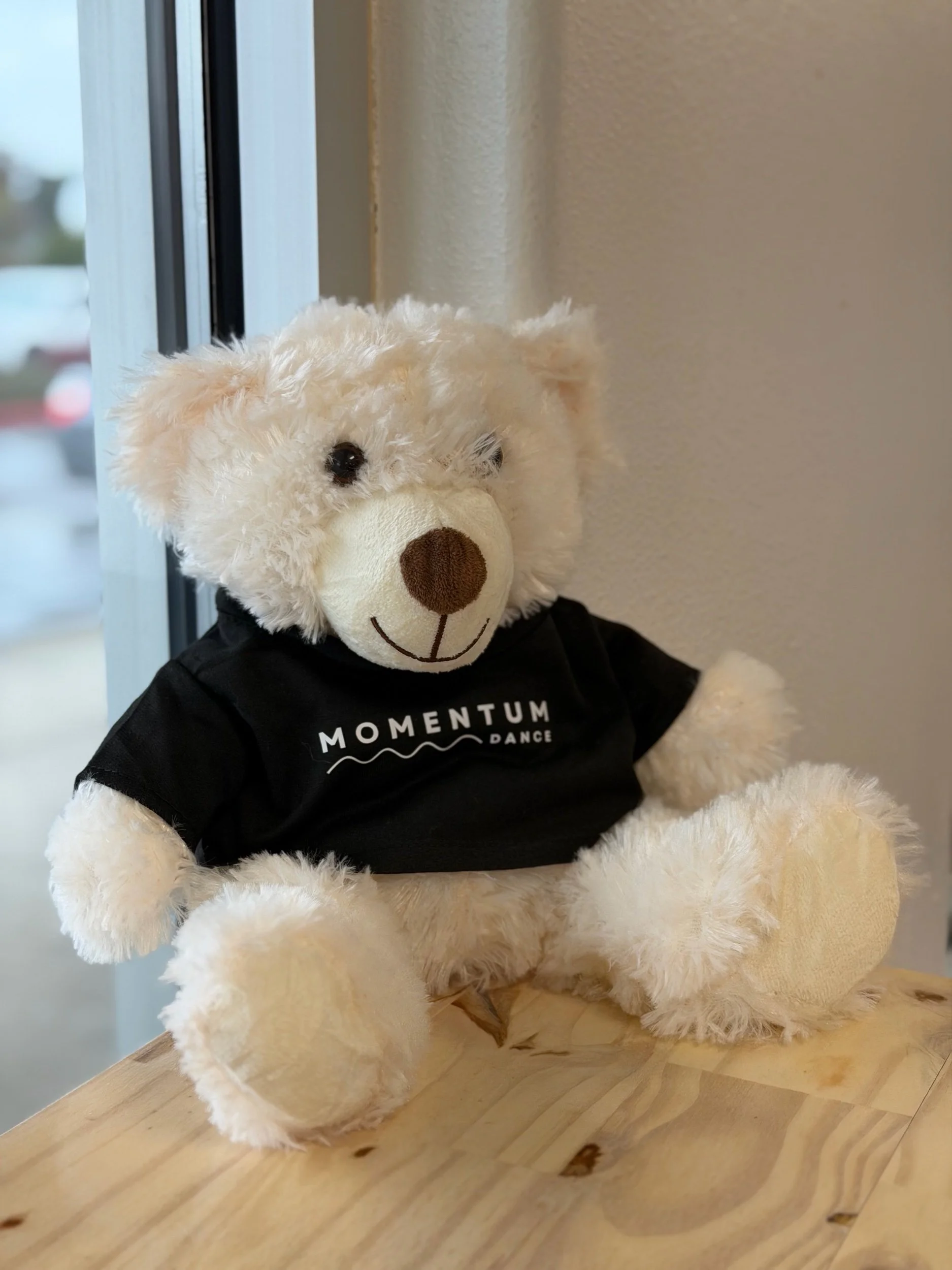 This 12" creamy-white, super-fluffy teddy bear comes dressed in a tiny black Momentum Dance shirt, ready to cheer on your dancer, ride along to class, or hang out at home. Soft, snuggly, and full of charm, Moe makes the perfect gift for little dancers, big dancers, and anyone who loves Momentum spirit.